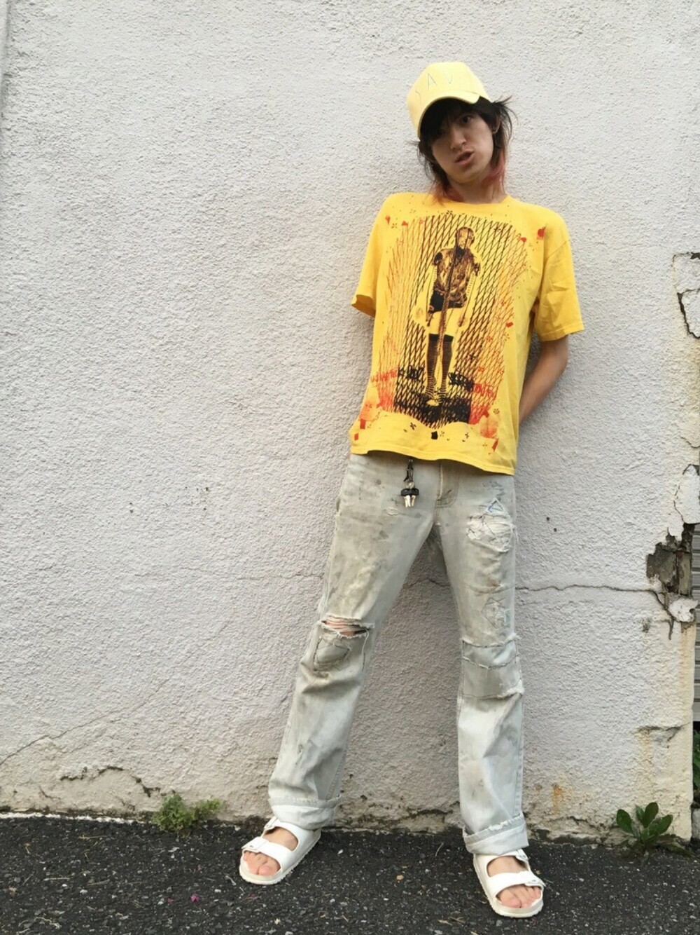 NOKIのリメイクTにボロボロにリメイクしたリーバイスのデニム なんだかんだこゆ緩い色合いのコーデがいちばん落ち着きます😽