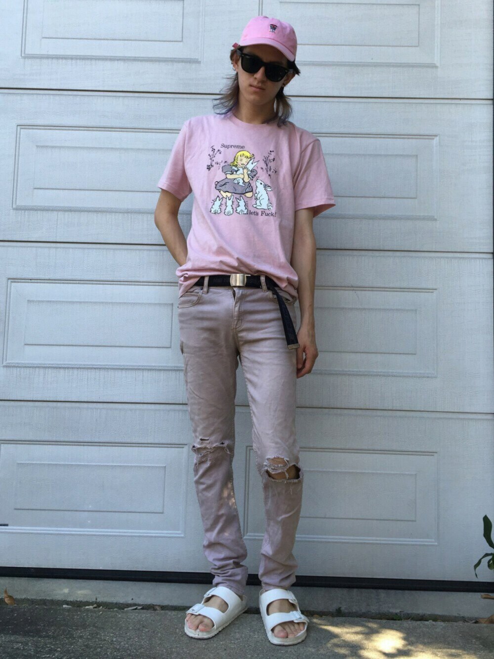 上からピンクが薄くなっていく様スタイリングしてみたら上手いことハマった(^ω^) ベルトとサングラスの黒で色合いを引き締めてます