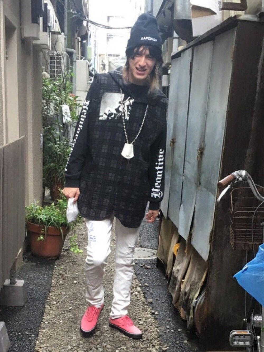 ヘックスのノースリーブシャツパーカーの下にはハードコアバンドのマーチ着て悪そうにしましたw 足元はピンクで色入れてみました