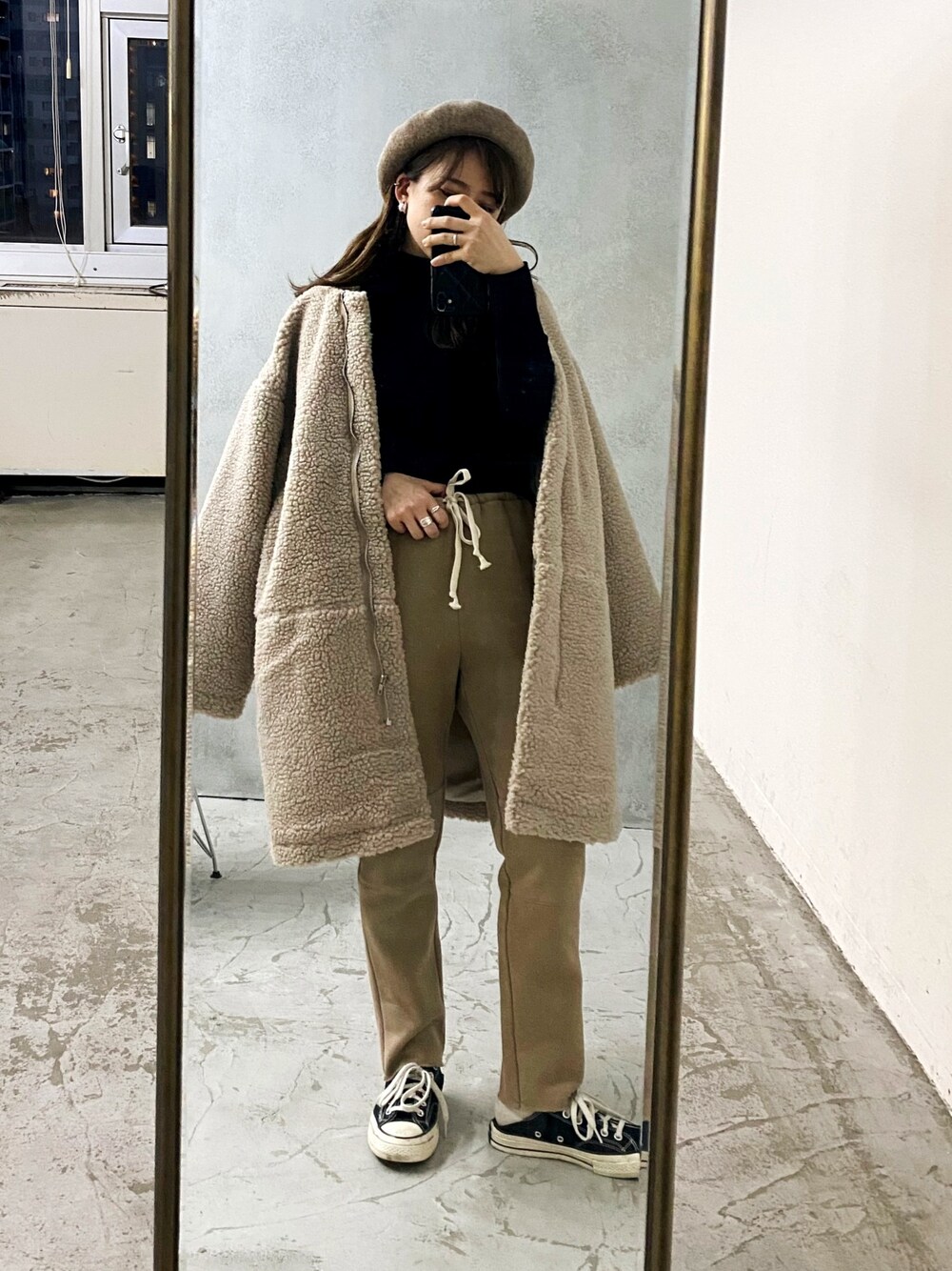 おはようございます🌞 今日から寒くなるみたいですね☃️ 皆さま体調には気をつけてください🙏 オールベージュにブラックで しめたコーデ◎ あえてもこもこちゃんに ラフな印象のジョガーパンツ合わせで 大人な楽ちんスタイルです♪ インスタやってます❣️ ▶︎chica_404