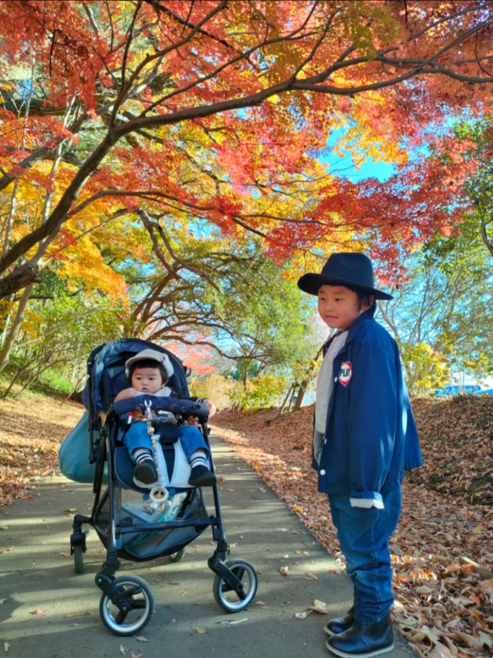13℃🌤️ @清水公園🎄🍁✨ コーチジャケットにまたしてもトレーナー×デニムでコーディネート🤍 (お兄ちゃんは先日の色違い😁) 日差しが気持ち良かったのでライトアウターにしたら思いの外風が強くヘビーアウターでも良かった、、、😅💦 紅葉が見頃なWinterマーケット🎄🎅✨ 相変わらず美味しい物を沢山食べて、お兄ちゃんはゲームもしたり楽しく過ごしました🍁🌿