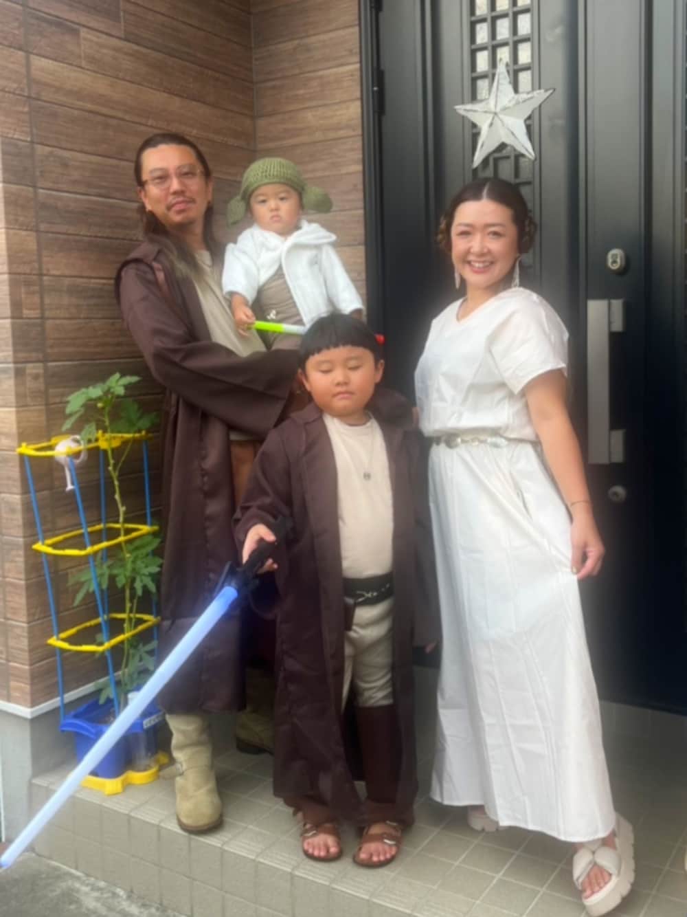 34℃🌥️ Halloween🎃👻@清水公園♥️ ハロウィンイベントがあったので少し早めのHalloweenを楽しんだ日の仮装コーデ✨️ 産まれたての頃から黒目がちでヨーダによく似ていた次男坊(笑)にベビーヨーダコスをさせたい!とゆーことで今年は一家でスター・ウォーズ風コスです♡ まだまだ暑くてだいぶアイテムも変えたけどソレッぽく出来たかな、、、😁??? ママ➡レイア姫 パパ➡クワイガンジン 長男➡ヤングジェダイ ※正確にはヤングジェダイではなくてアナキンの子供時代らしいのですが私はニワカ過ぎてサッパリ🤣 次男➡ベビーヨーダ 折角ならこのコーデでDハロインパしたいなぁ…🥹💗 今年はハロウィンディズニー行けるかなぁ〜♡