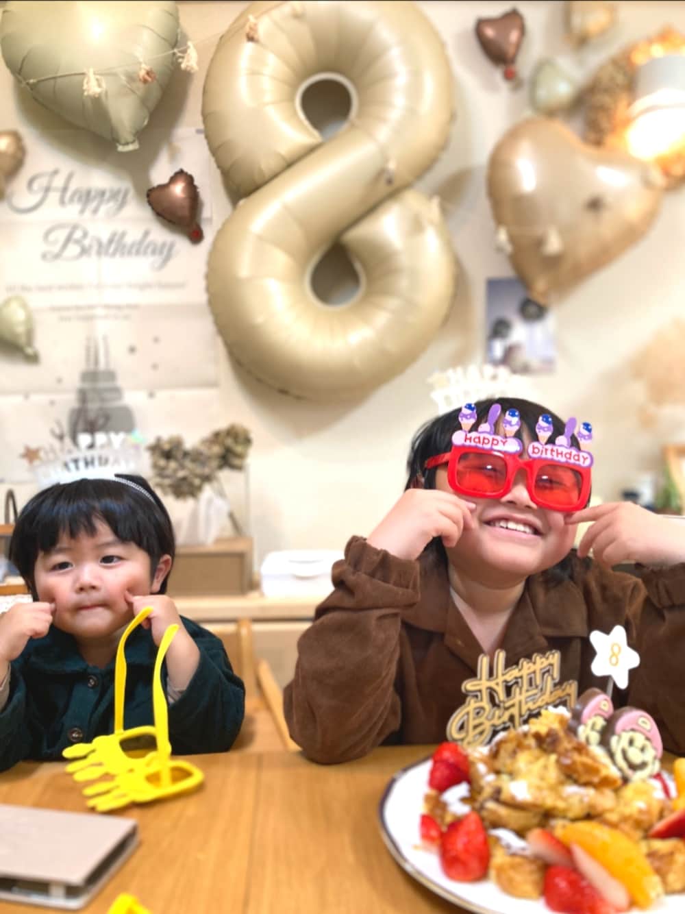16℃☀️ Big Brother's B.D party🎂🪅 インフルB&胃腸炎でリスケのリスケで1ヶ月以上遅れてやっとこさお兄ちゃんのB.Dパーリー🥹♥️✨ いっちゃん8歳おめでとう🎉 ついこないだ小学生になった気でいるのに間もなく3年生なんて信じられない母です😭✨ パパも出張帰りになんとかお祝いに顔出し♡ ママとチビズはコーデュロイで素材リンクコーデにしてみました🤗💚🤎