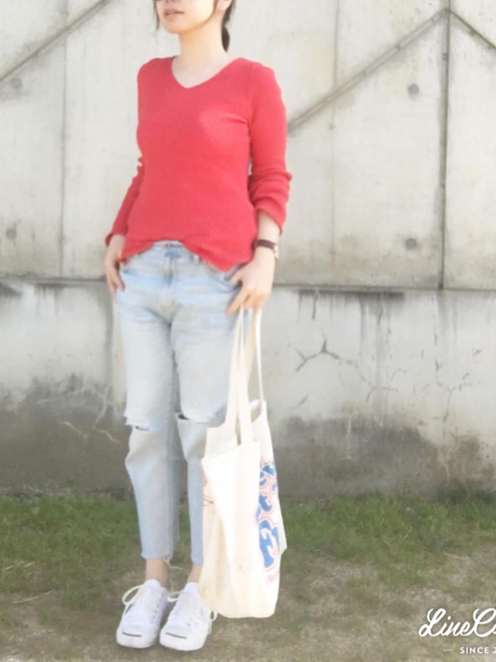 休日です🌼 赤トップス、今年は挑戦してみました! 淡いブルーデニムと♡ 見ていただきありがとうございます(๑˃̵ᴗ˂̵)❤️