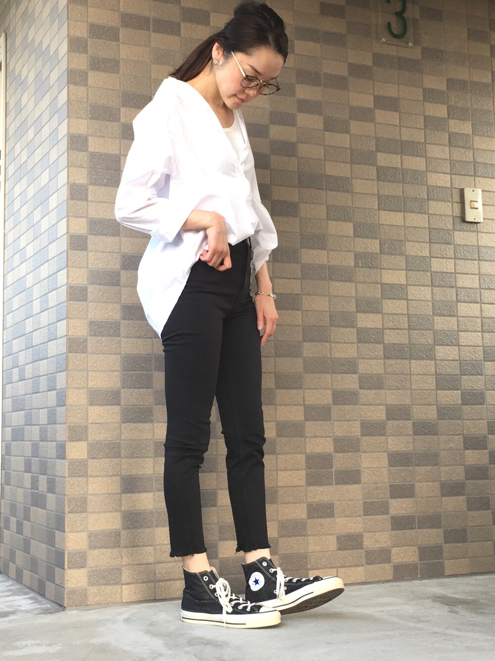 白シャツ×スキニー×スニーカー🐈 モノトーンにシルバーアクセ❤︎ 変形シャツ久しぶりに着たらやっぱりかわいい! ラフラフ🐈 Instagram.........lailaaa0701📷