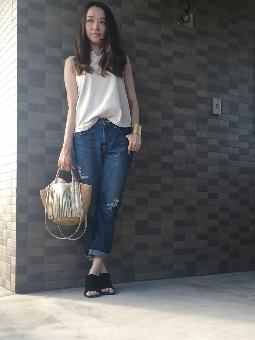 おはようございます☺︎ シンプルに小物でゴールドを✴︎✴︎ GUのトップス素材感も肩周りの後ろのデザインもかわいい!✨ 本日もお付き合い頂きありがとうございます☺︎