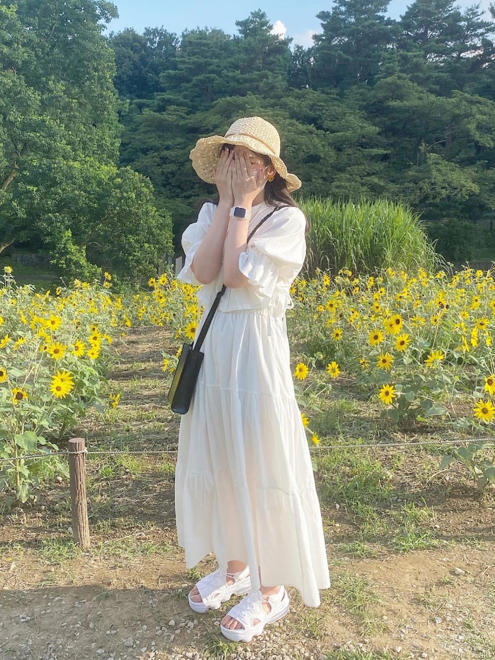 ひまわり畑コーデ🌻 w closetのワンピースは2wayで着れるからお得感ある🙆🏻 白でまとめてみました〜!🐻❄️