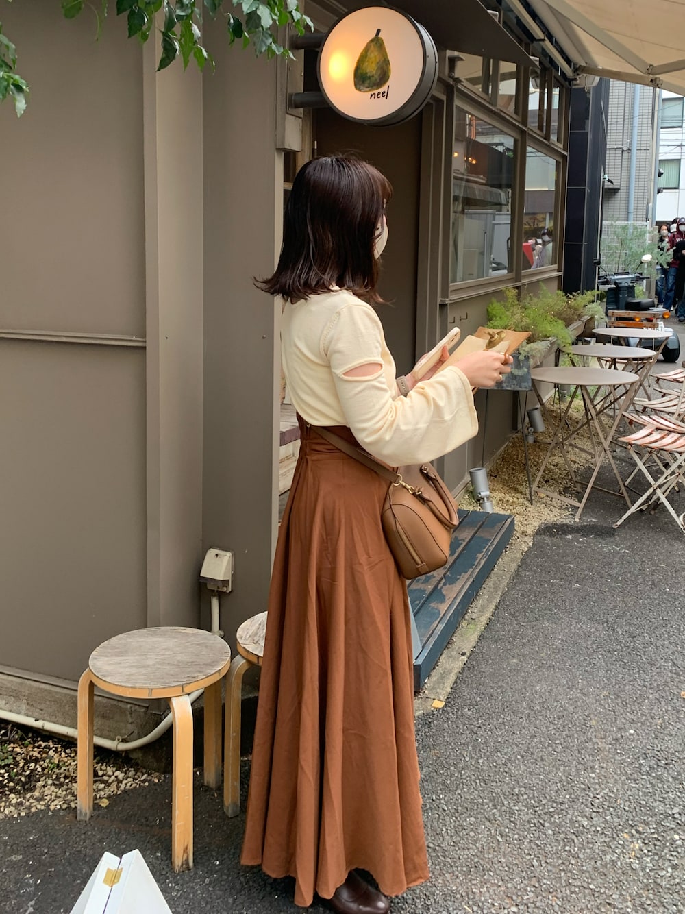カフェ行った時のコーデ☕️🥪 オレンジブラウンの秋っぽいスカートがお気に入り🎃