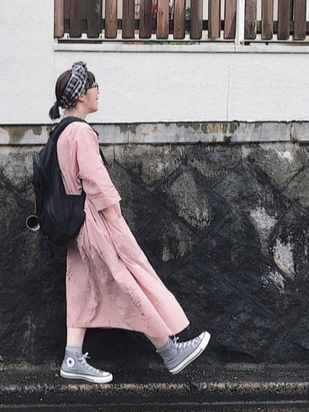 台風7号接近中につき 本日は家族みんなお休みに 珍しく色に惹かれた サーモンピンクのワンピース ワイドな身幅と落ちる肩 両サイドについた四角いポッケが 可愛いのです