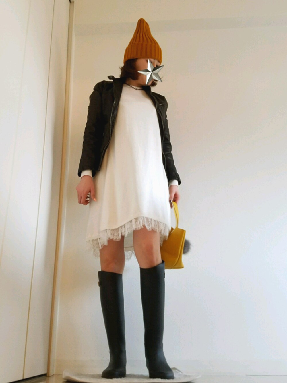 今日も。。たまってるpicを。。。📷✨ 雨の日コーデ☔ こんなにお天気のいい日に。。。😅 ソウルで買ったラムレザーのライダース❤ マット加工になっています💮 ソウルにはレザーたくさんあるから、選ぶの大変なんだけど💧💧💧 好みのモノに出会えてよかった😍 かわいい系のワンピは、ソレだけだと気が引けるけど。。。😒 甘辛mixにすれば大丈夫💜 かわいい系は、ハードなモノに合わせるために買ってます😋