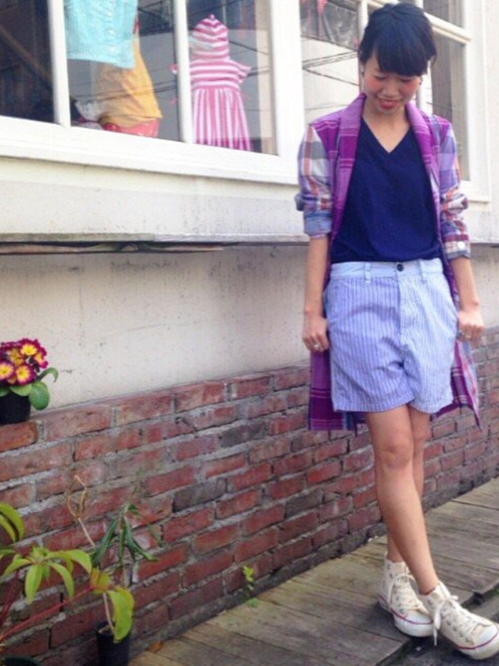 チェックにストライプという柄on柄を同系色でまとめることでスッキリと見せました✴︎ 素足にスニーカーで抜け感も演出!