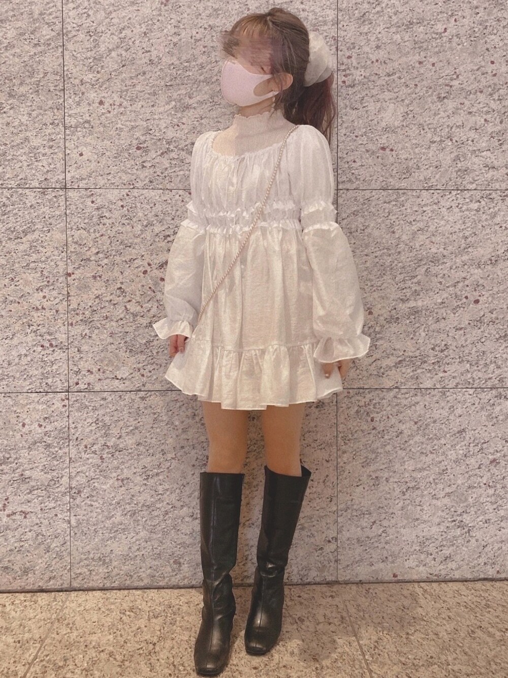 白チュニックに 黒のロングブーツで大人ガーリー🖤 ロングブーツいつまで履けるんだろ💭