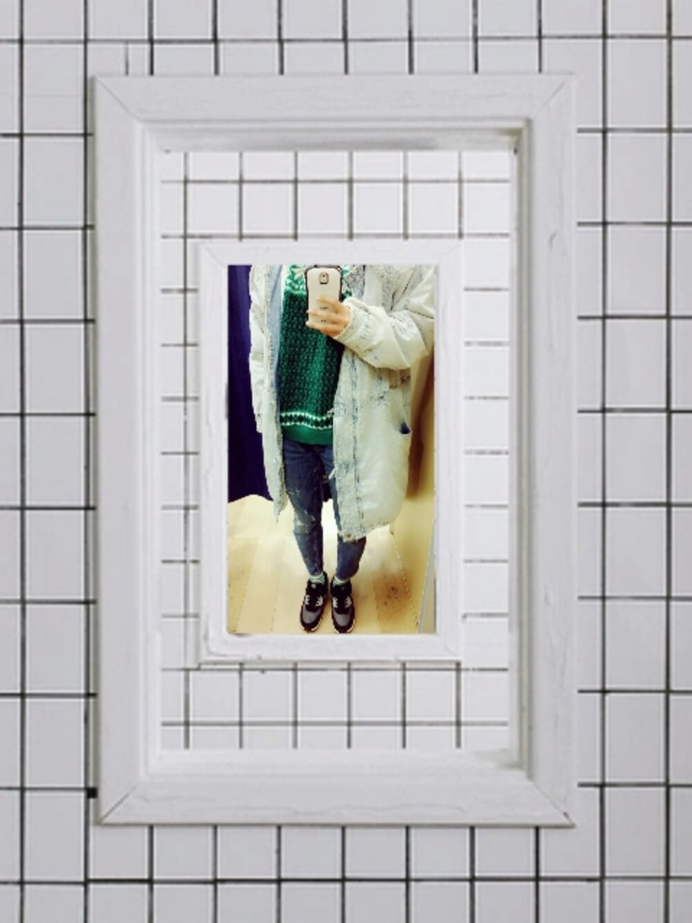 ブルー系のデニムパンツ、ブラック系のスニーカーを着用したレディースの冬コーディネートの1枚目の写真