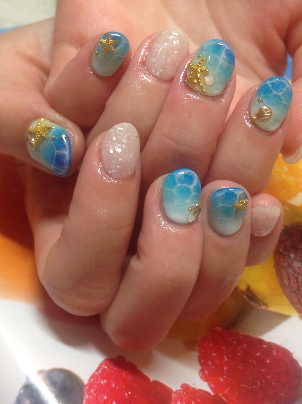 サマーネイル♡ 海モチーフが大好きな私にとって この季節にシェルパーツのネイルはマスト! ほんとーにテンションあがります☆☆ あぁ、、、 今年は海に行けるかなぁ、、😢 そんなプライベートとは裏腹に せめてネイルで夏気分👙 ヒトデパーツは今年はじめて。