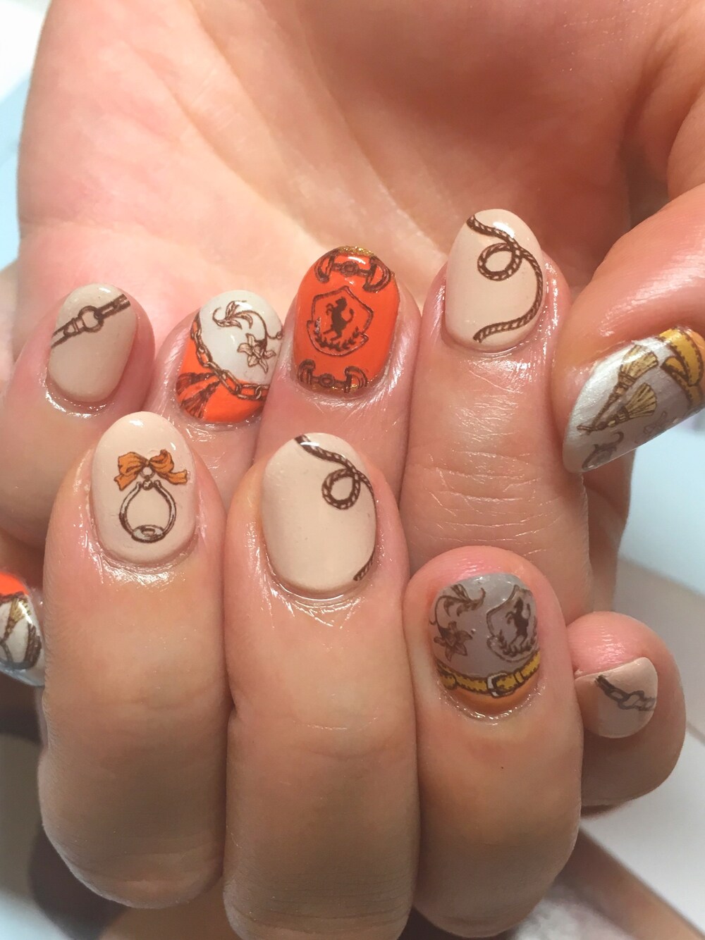 ご無沙汰しております💦 まだまだ寒いですが もう2月末! お店はすっかり春ですね♪ 今年はスカーフが流行るとのことで すでに腕や髪に巻き巻きしているわけですが、 今月はネイルにも✨ エルメス風。笑 ワガママ言ってシールを用意して頂きました☆ すごくお気に入りです♡