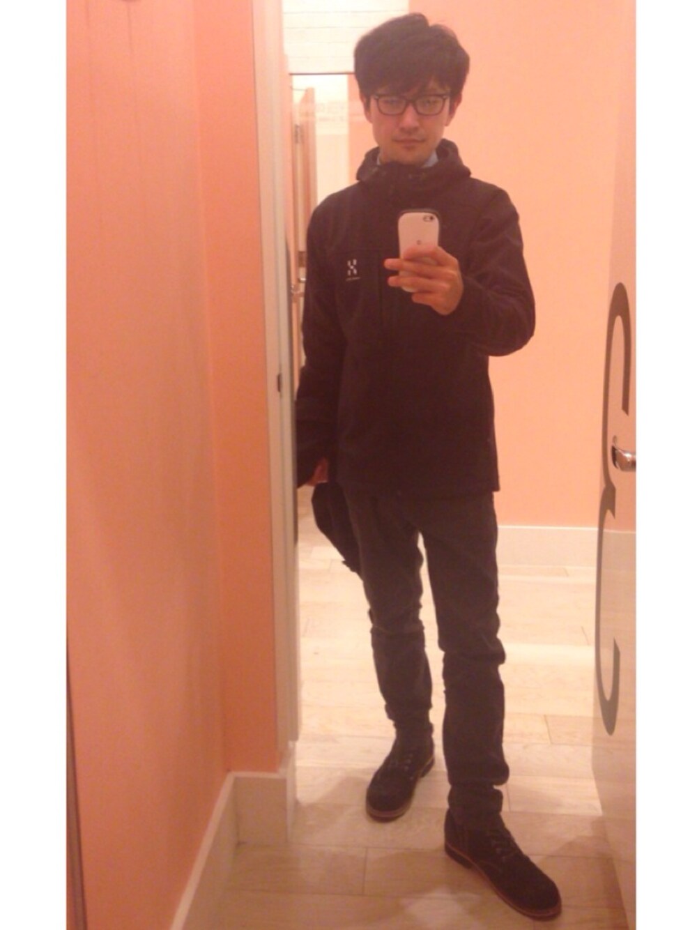 ブラック系のマウンテンパーカーを着用したメンズの秋コーディネートの1枚目の写真
