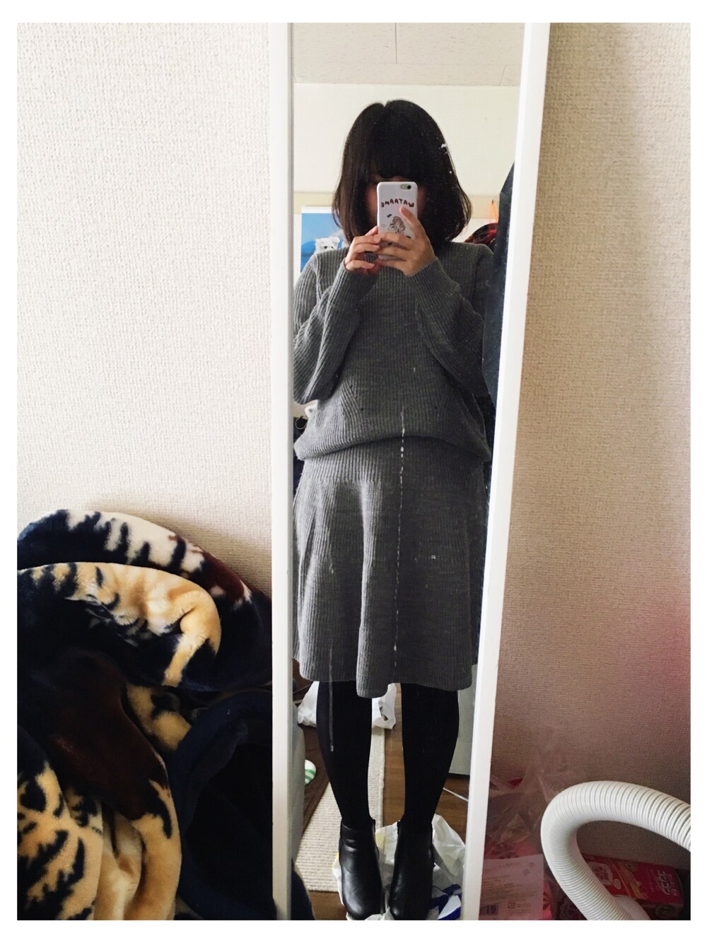 グレー系のニット/セーター、グレー系のスカート、ブラック系のブーティを着用したレディースの冬コーディネートの1枚目の写真