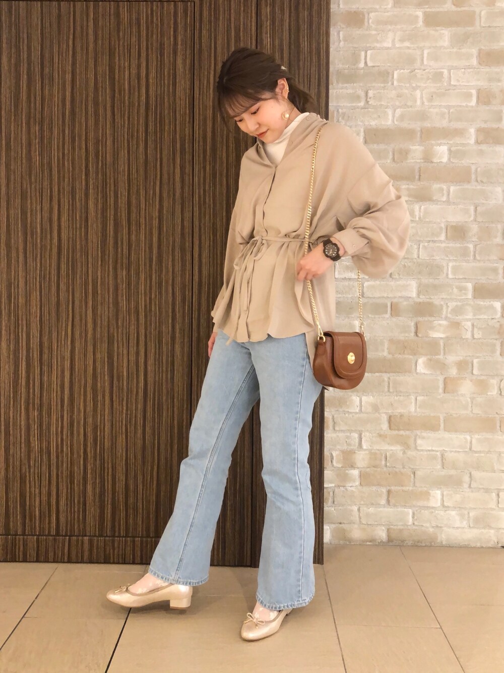 とろみのある素材のチュニック❤︎ ボタンを全て閉じて着るのも 2.3個ボタンを開けて抜き襟で着るのも◎ パンプスはシルバーとゴールドの 中間という絶妙なカラーで可愛いです❤︎