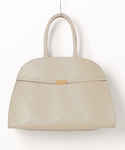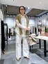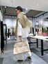 オールホワイトコーデにゴールドカラーなニットをアクセントでON. 革小物はベージュで統一させてトーンコーデを意識して。