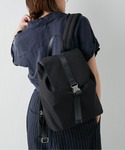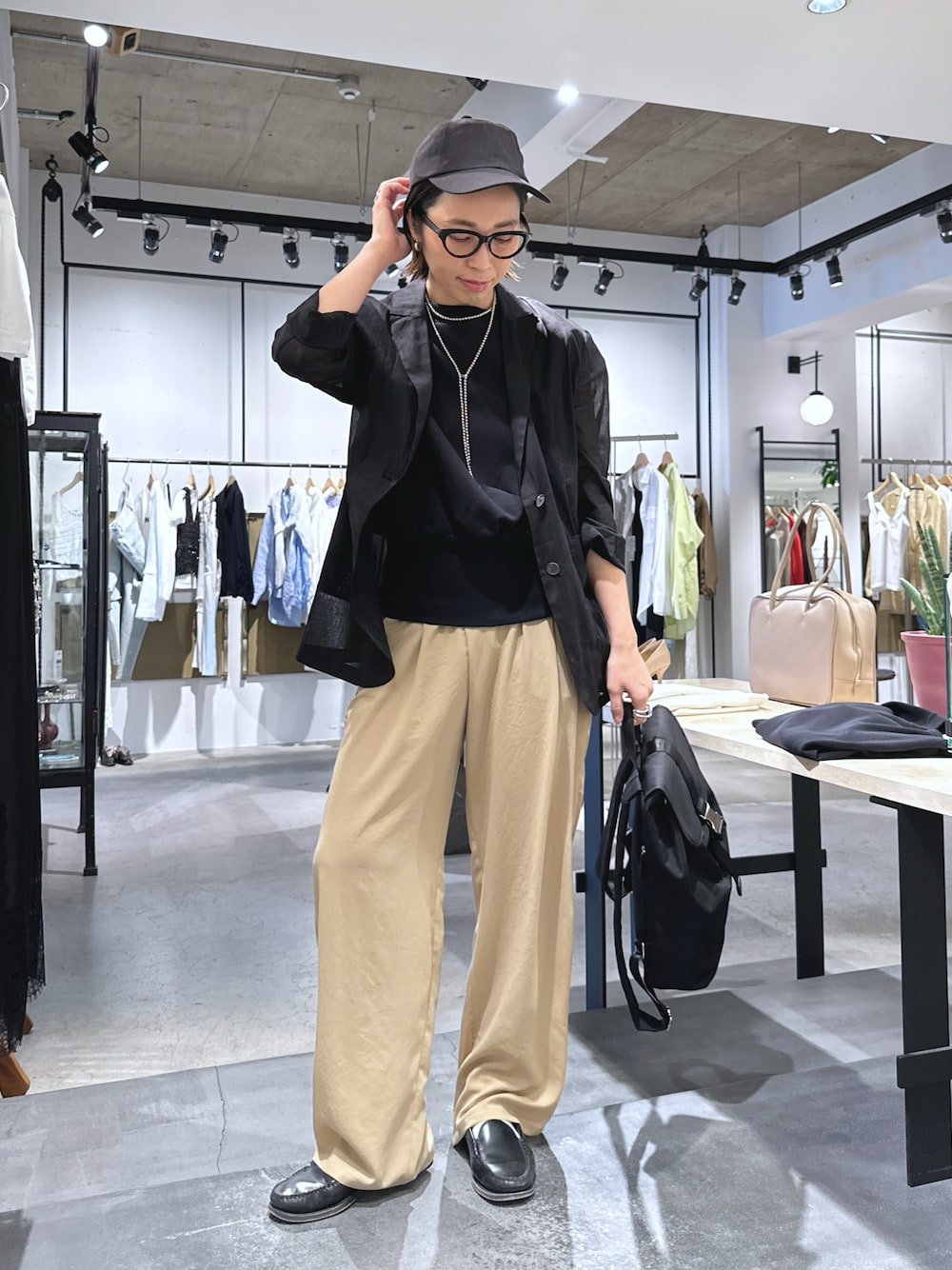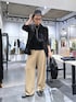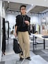 黒ベースのスタイリングにベージュパンツで明るさをプラス。 キャップとリュックでスポーツミックスなスタイルに。
