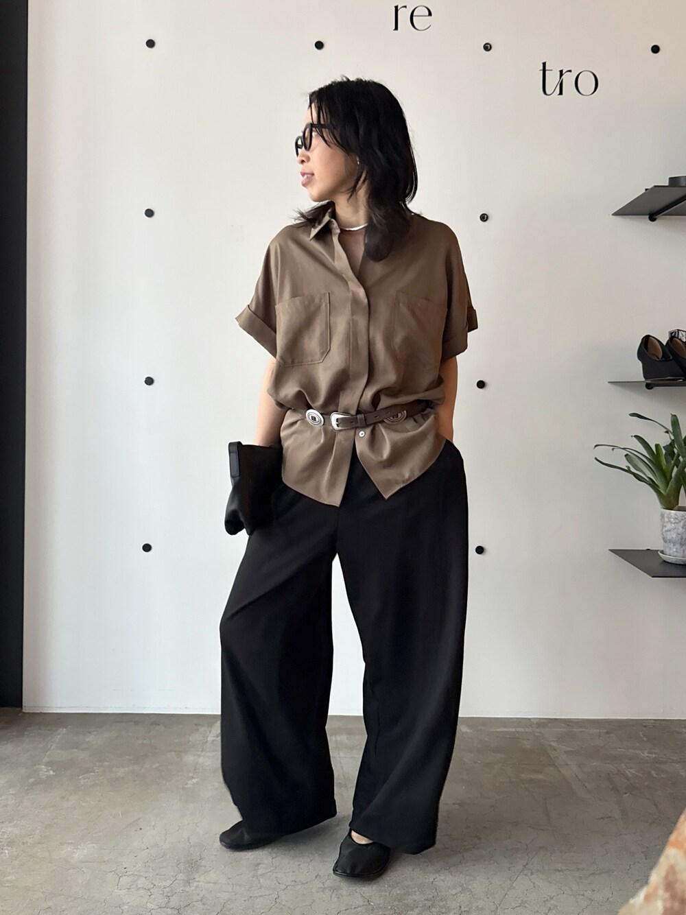 【とろみシリーズ】ミリタリーハーフスリーブシャツで、軽やかで楽ちんなスタイリング。 PUNTOVITAのコンチョベルトと組み合わせれば、スタイリッシュなハンサムコーデが完成。 アクセントになるベルトで体型カバーも叶えます。 インスタライブでの紹介アイテムとしても注目を浴びるこのシャツは、40代の方にもおすすめ。 普段使いから特別な日まで、シーンを選ばず活躍すること間違いなしです。