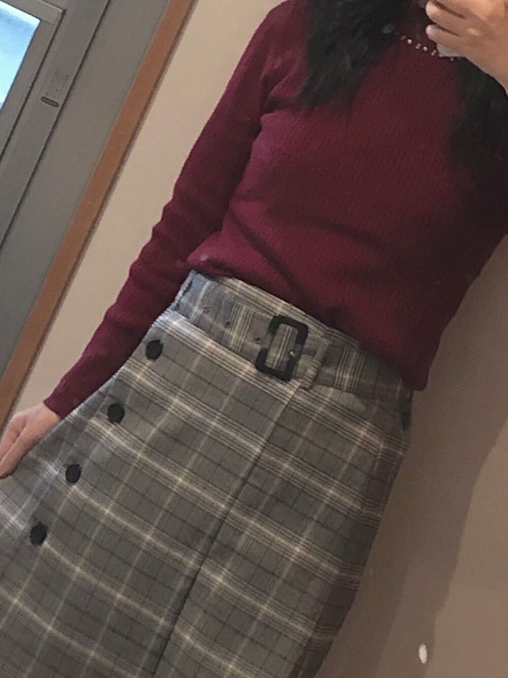 グレー系のスカート、レッド系のニット/セーターを着用したレディースの冬コーディネートの1枚目の写真