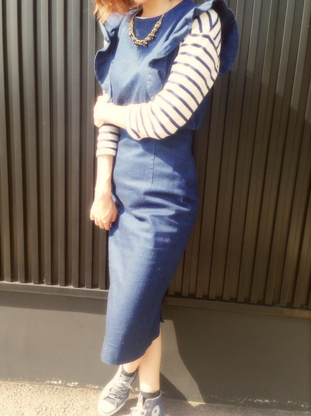 タイトなシルエットでデニムワンピでもオトナカジュアルに♥︎