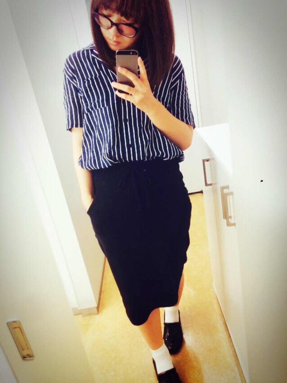 テーマは事務のおばさん ストライプだと思って 買ったオープンシャツ... 実は、ストライプと薄っすら チェック柄でした 可愛いからまぁいいか〜