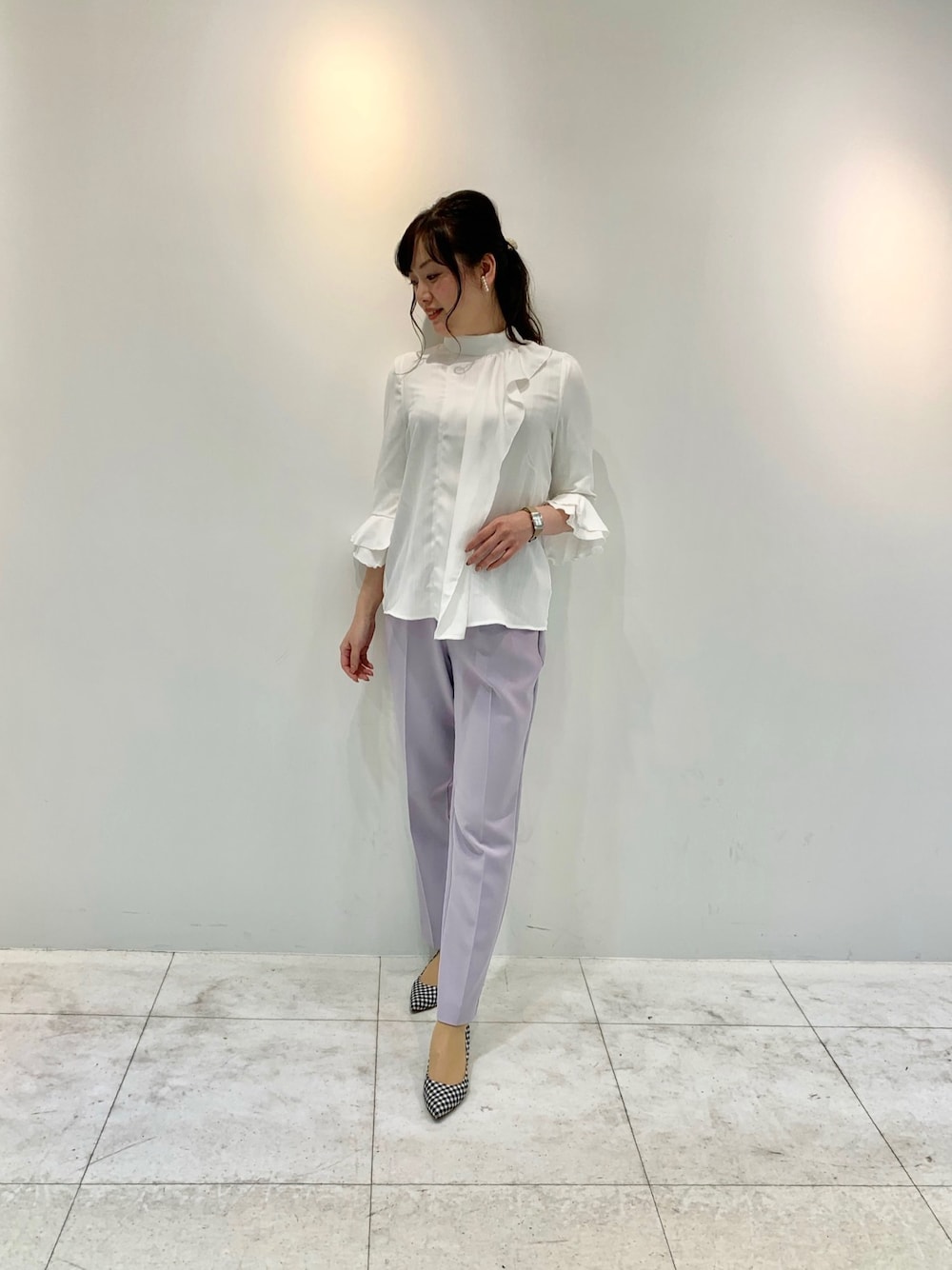 首から裾までの流れる様なフリルと 袖口のフリルがとてめ新鮮なブラウス 透けにくくサラッと着れます❣️ ラベンダーカラーのパンツを合わせて 春先取りコーデ🍒 ブラウス 10-11-02-022 0サイズ 01カラー パンツ 30-11-09-607 1サイズ 82カラー