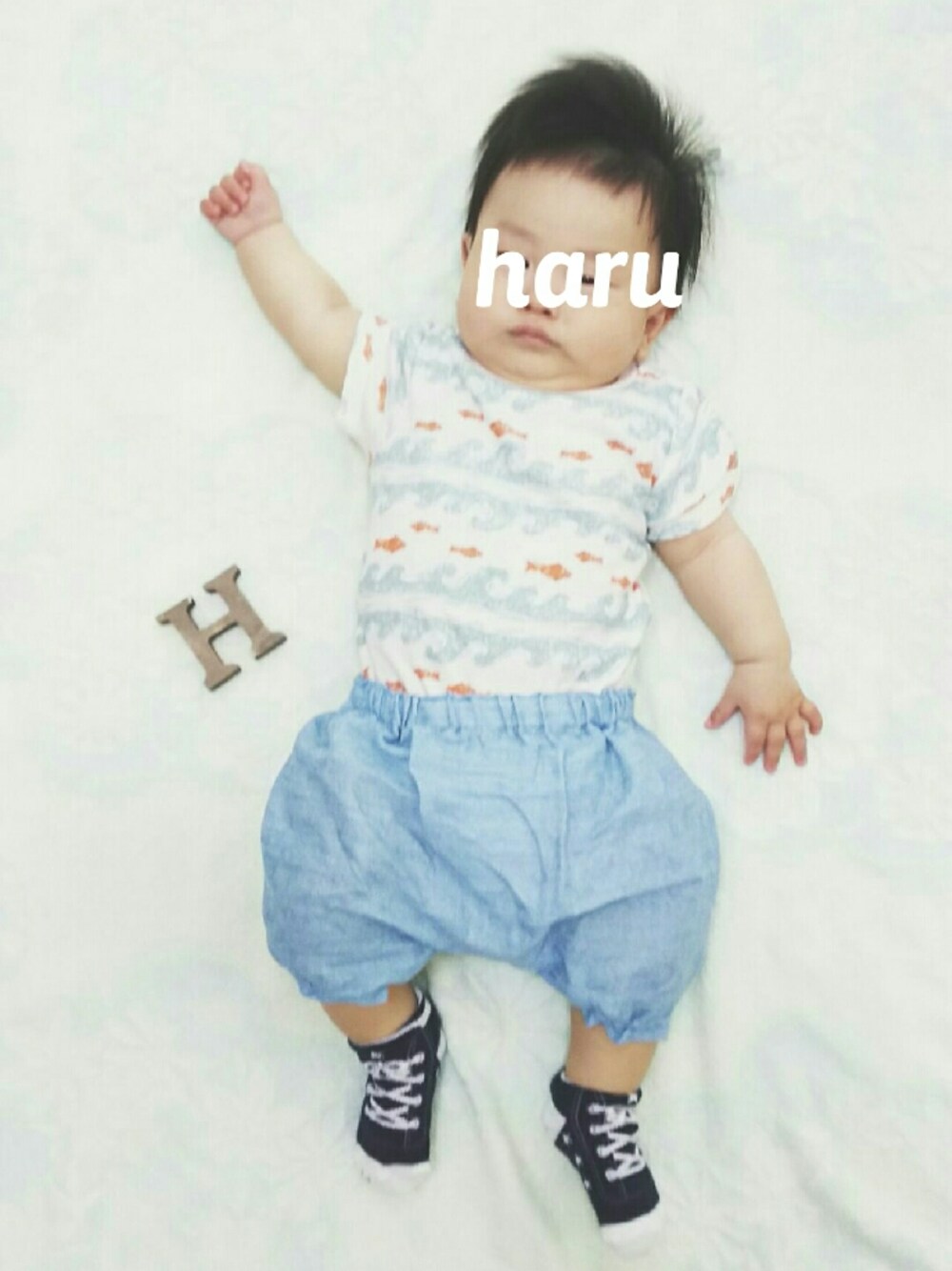 save,コメント,いいね ありがとうございます! 今日はカボチャパンツを作りました(^^) このたっぽり感が好きです♡ デニム風のWガーゼ生地なので 夏もたくさん履いてもらえそうです! しわしわなのは、、、すいません(笑) 上はロンパースなのでお腹が冷えない仕様です♡