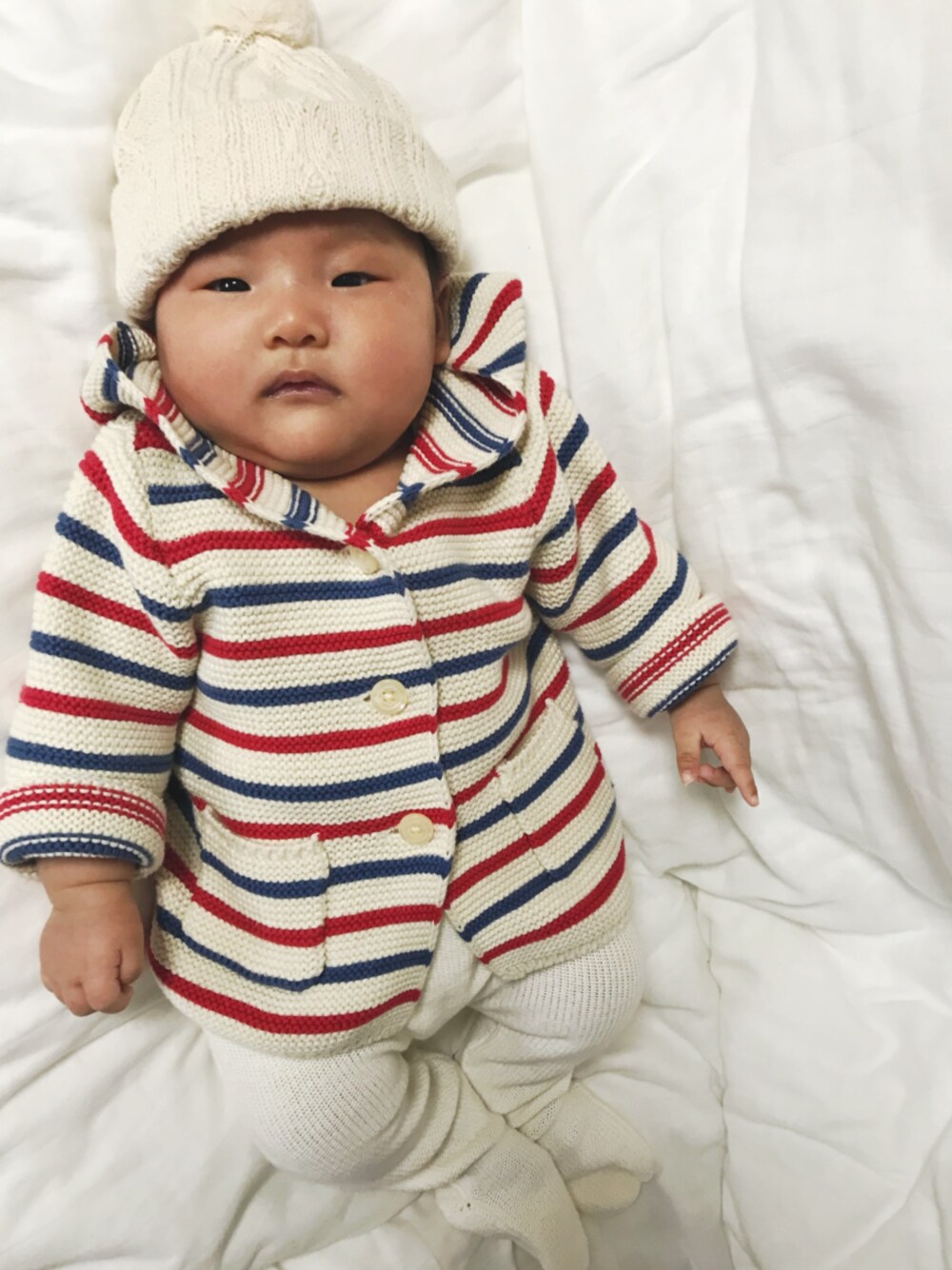 今日は眠かったみたいで、 着替えさせても寝てたw 奇跡的に目を開けた1枚.* あしたからあったかくなるってコトで かぶれなくなる前にぽんぽん帽をっ☆