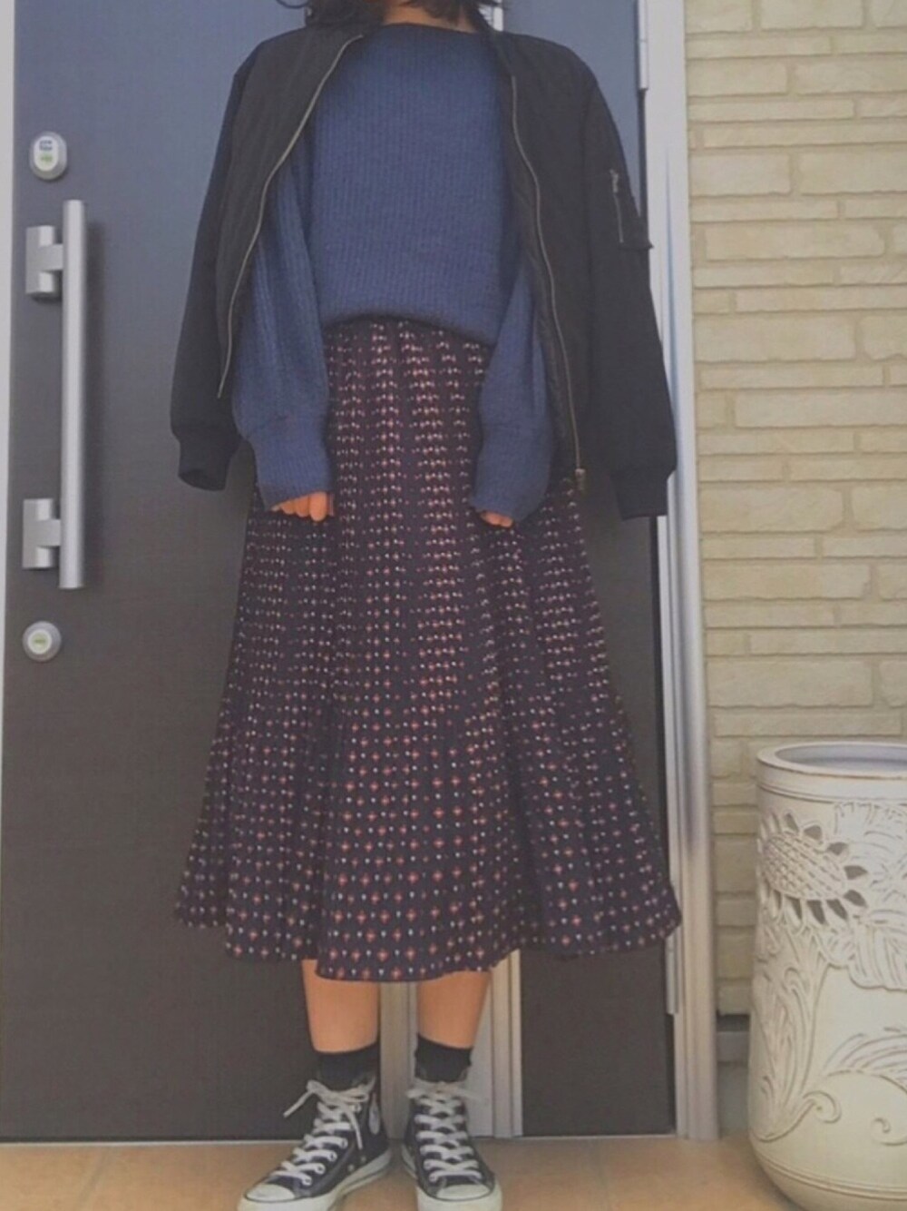 ニットはくすんだ青の色がめちゃめちゃ可愛い 首元の形も身体を華奢に見せてくれて優れものです🤤 柄スカートもプリーツスカートであり フレアスカートでもあるので 脚を細く見せてくれるし なかなかない形で個性的で一目惚れしました☺︎ よかったら覗いてみてください👀 Instagram : @chiroom13