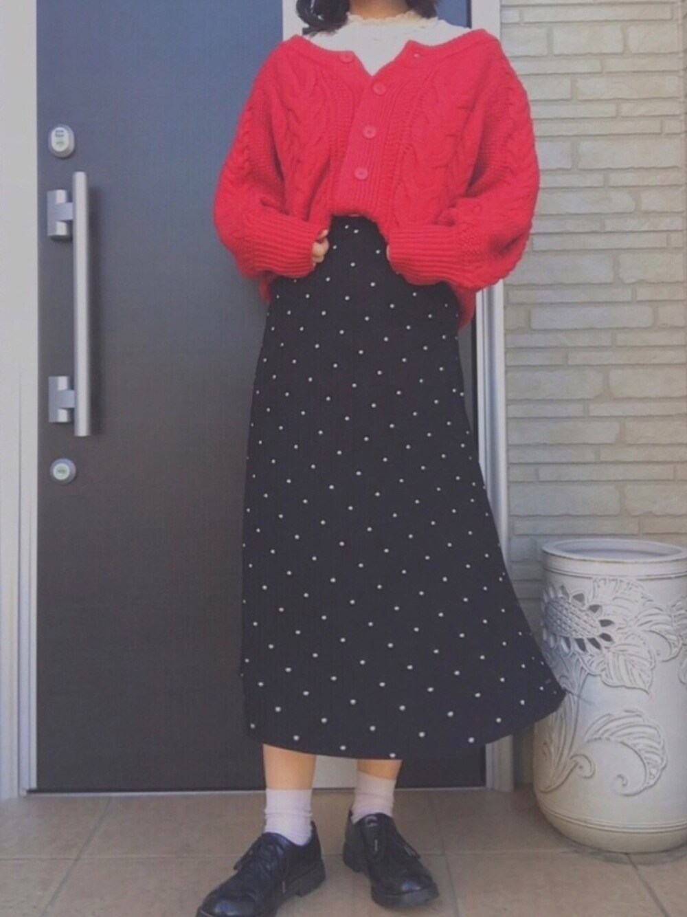 カーディガンは 1つボタン開けて着るのにはまってます☺︎ これ着るだけで「クリスマス??」って言われがち💭 スカートはシルエットを細く見せてくれるので ボリュームトップスとの相性抜群🤤 レースアップシューズ履いてますが バレエシューズでも よりレトロで大人ぽく見える気がして良きです🌟 よかったら覗いてみてください👀 Instagram : @chiroom13