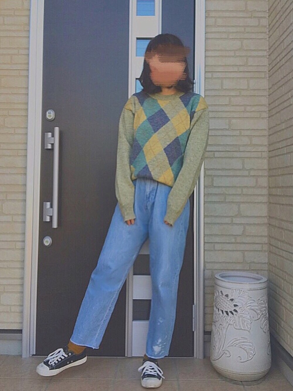 アーガイル柄のニット この色珍しいなあって思って買いました🙌 さわやかな色合いなので 冬でも重たくならずに着られます☺︎ デニムは掃除してる時に 漂白剤が飛んで色抜けちゃいました🤥 でもリメイクぽくなってありかなあと🤥 靴下はニットの黄色と合わせて マスタードカラー履いてます🧦 よかったら覗いてみてください👀 Instagram : @chiroom13