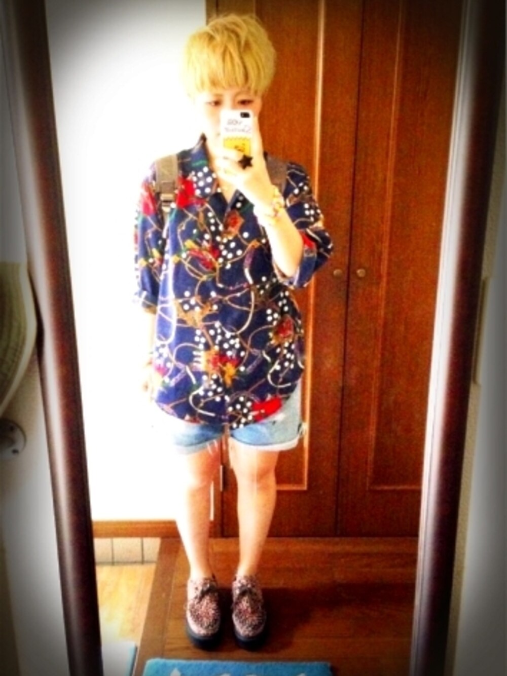 信じれば、ほら、そこにあるんだよ。 シャツは、 フリーマーケットにて20円とかで買った。 肩パットめっさ入ってたのを切り取って、 防虫剤の匂いもすごかったから、何回も洗って、 いまに至ります。 フリーマーケットは掘り出し物たくさん、 探せば絶対でてくる。 シャツに短パンにヒョウ柄ラバーソール 今日はあっついのー、