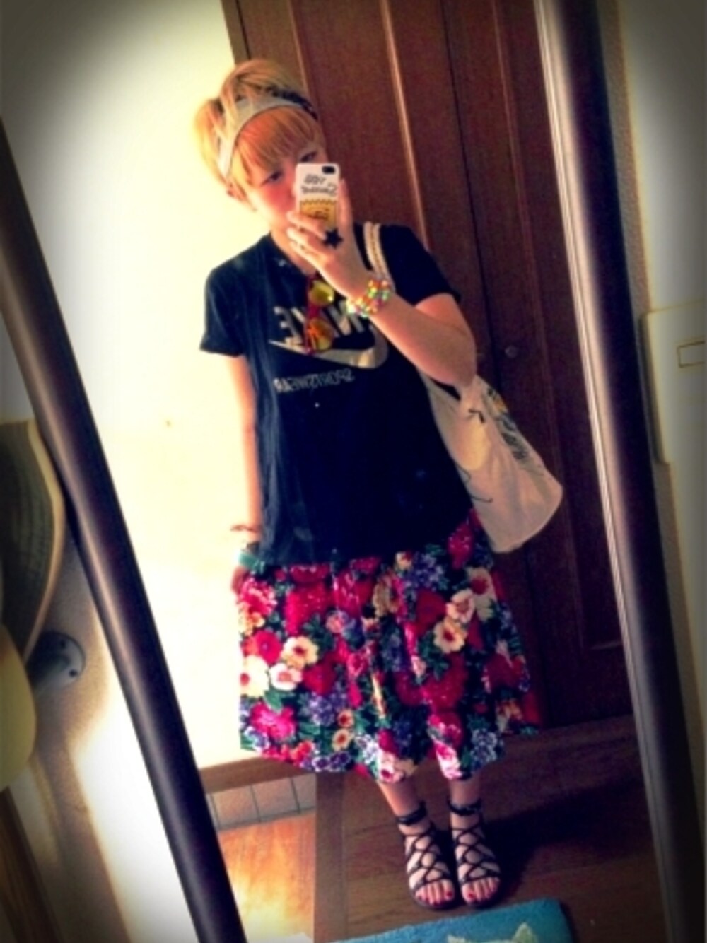 めいっぱいの花を咲かせ NIKEの半袖Tシャツに インパクトのある花柄スカート サンダルは文化屋雑貨店のもの。 頭にターバンまいて、 あら、 今日は女の子っぽい? スカートって涼しいかとおもったけど、 そうでもないな、 久々にはいたからわからなかった。 つらい。 あちーー!