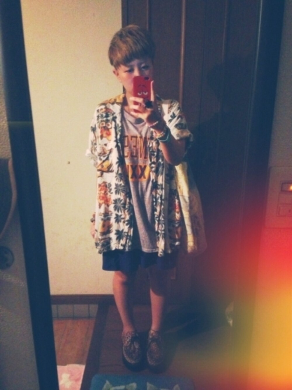 南国に抱かれて アロハシャツに 古着Tシャツに キュロット風短パンに ヒョウ柄ラバーソール これからバイトのミーティングです。 それだけ これだけのためにこの格好 もっと手を抜いてもよかったなあ でもアロハシャツ着たかった! 明日も着ようかなー、 いうて3時間くらいだし、 うむうむ