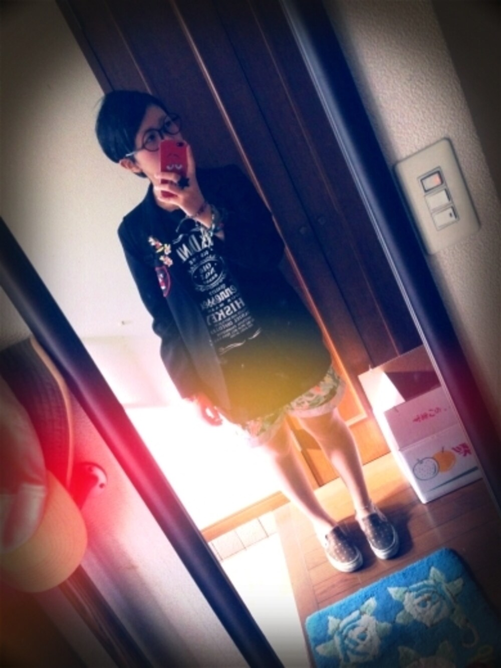 最大の敵はジョウシキってやつ、 はぁ… 朝から何度目のため息 大学で1番偉い人に挨拶せないかんいうことで、 スーツ着なくては、 というこで黒髪 朝からスプレー撒き散らしました。 ため息が止まらない。 でも黒髪でもおかしくない服装にしたくて、 真面目ちゃんぶってみた。 黒のノベルティTシャツは、 ジャックダニエルの非売品です。 それに黒のジャケットをはおる。 ジャケットにはディズニーキャラのピンバッジ 下は派手海パンではずす。 靴はVANSのスリッポン 決めてはマルメガネ。 はぁ…、 はやく帰って風呂はいって髪の毛洗いたい。
