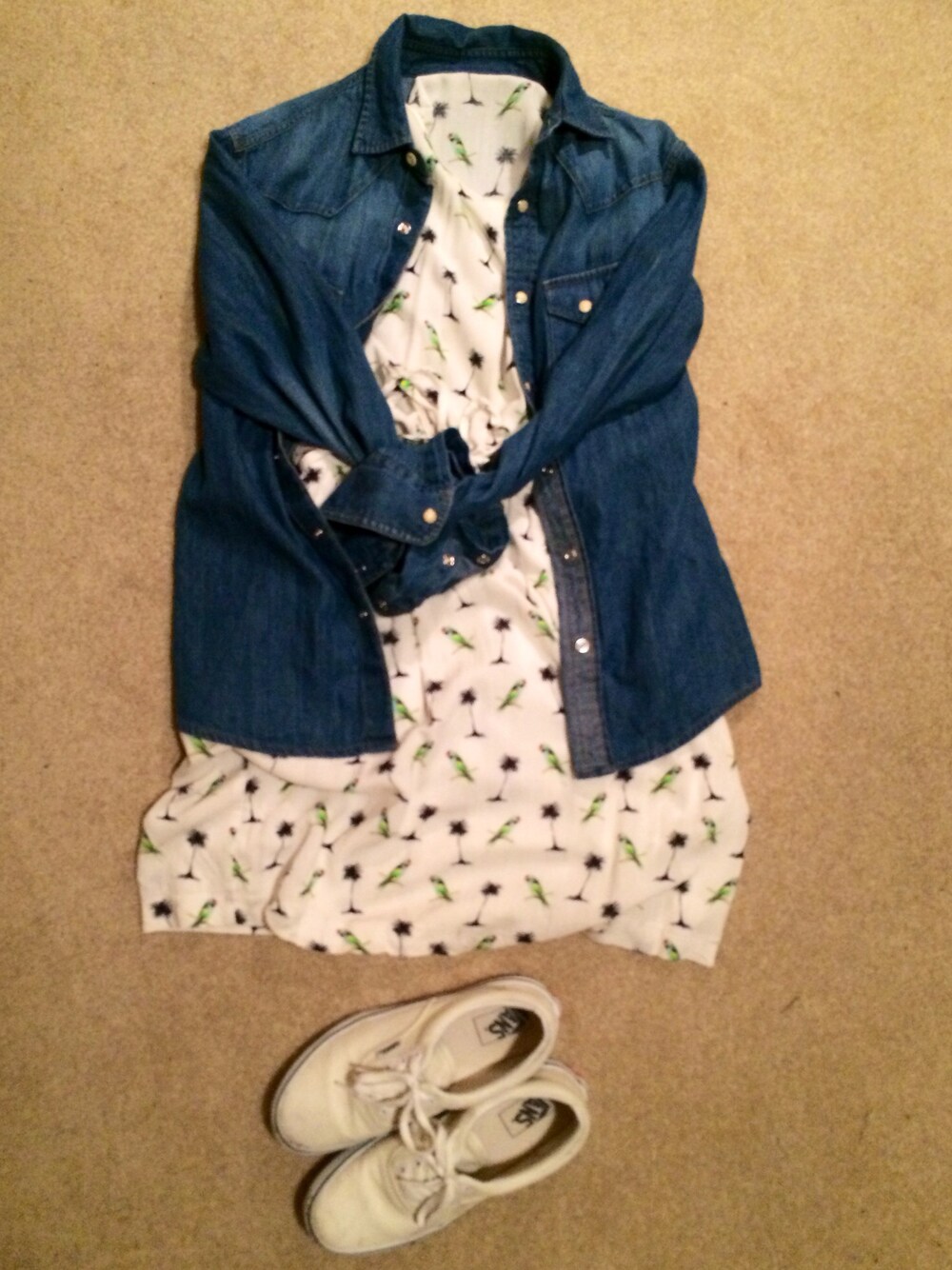 ワンピース ZARA デニムシャツ g.u. 鳥とヤシの木柄のワンピース。 私の中では鶏ガラワンピース! ♡
