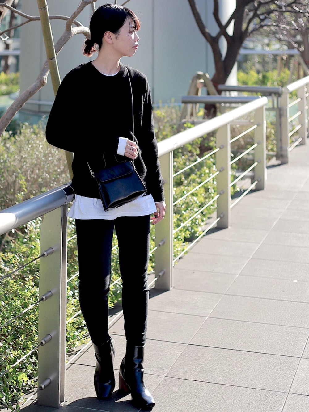 春に向けてのブラックコーデ オールブラックにしたいけど重たくなるので、ロンTを忍ばせて流行りのレイヤードをきかせました。