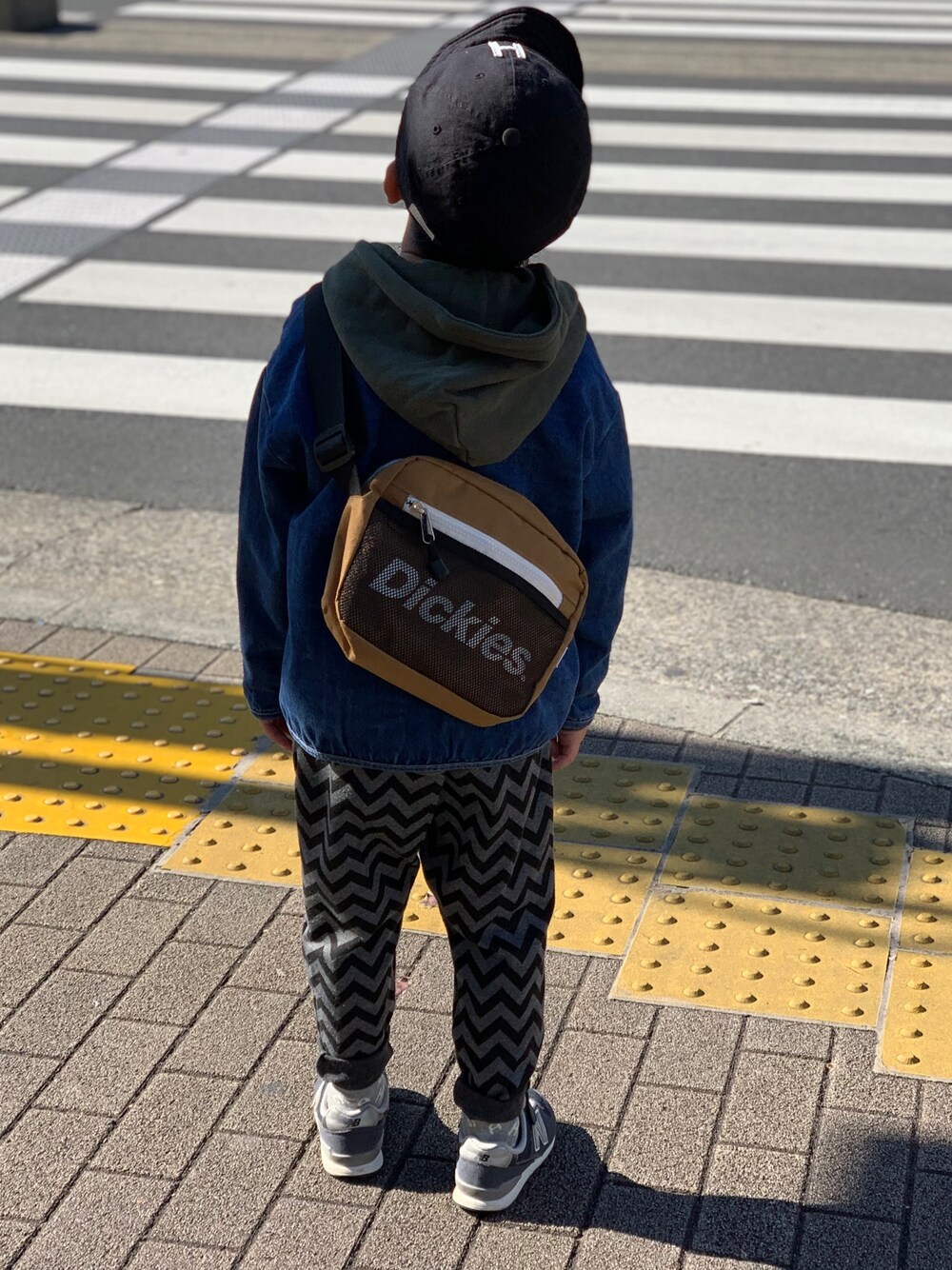 暖かい日はデニムノーカラージャケットにパーカースタイル✨ 大人用dickes ショルダーは意外に子供にちょうどいい👌