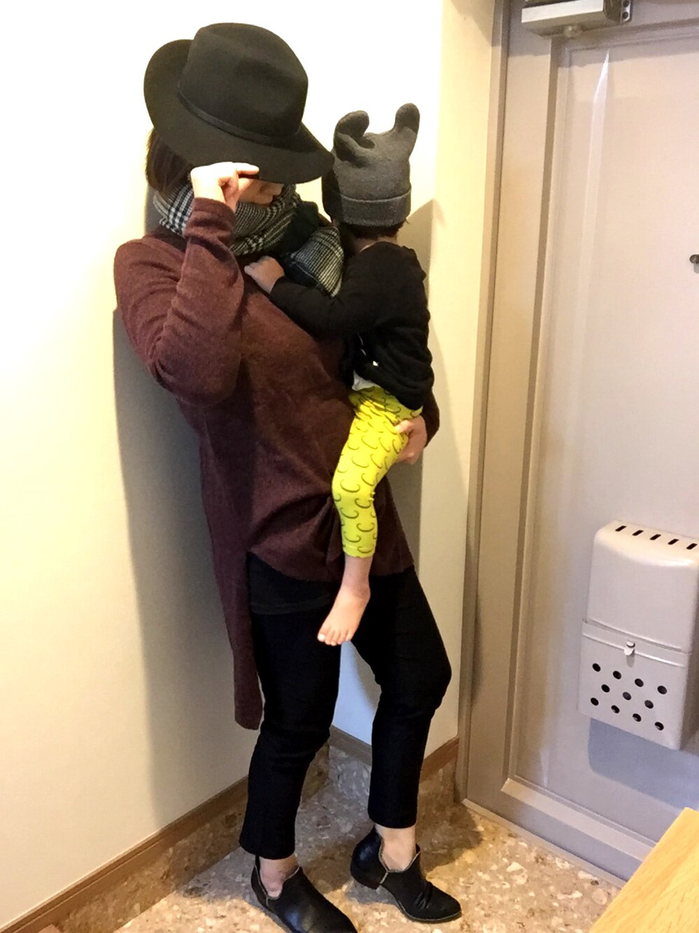 今日は息子と一緒に💕 息子の帽子はoriginal designです。これは気に入ってくれた様で毎日保育園の行き帰りにかぶってくれます^_^黒と黄色のパンツで派手になり過ぎない様に。 私は今日仕事でカラダを動かすので、ロングニット✨マフラーはボリュームのある物を✨