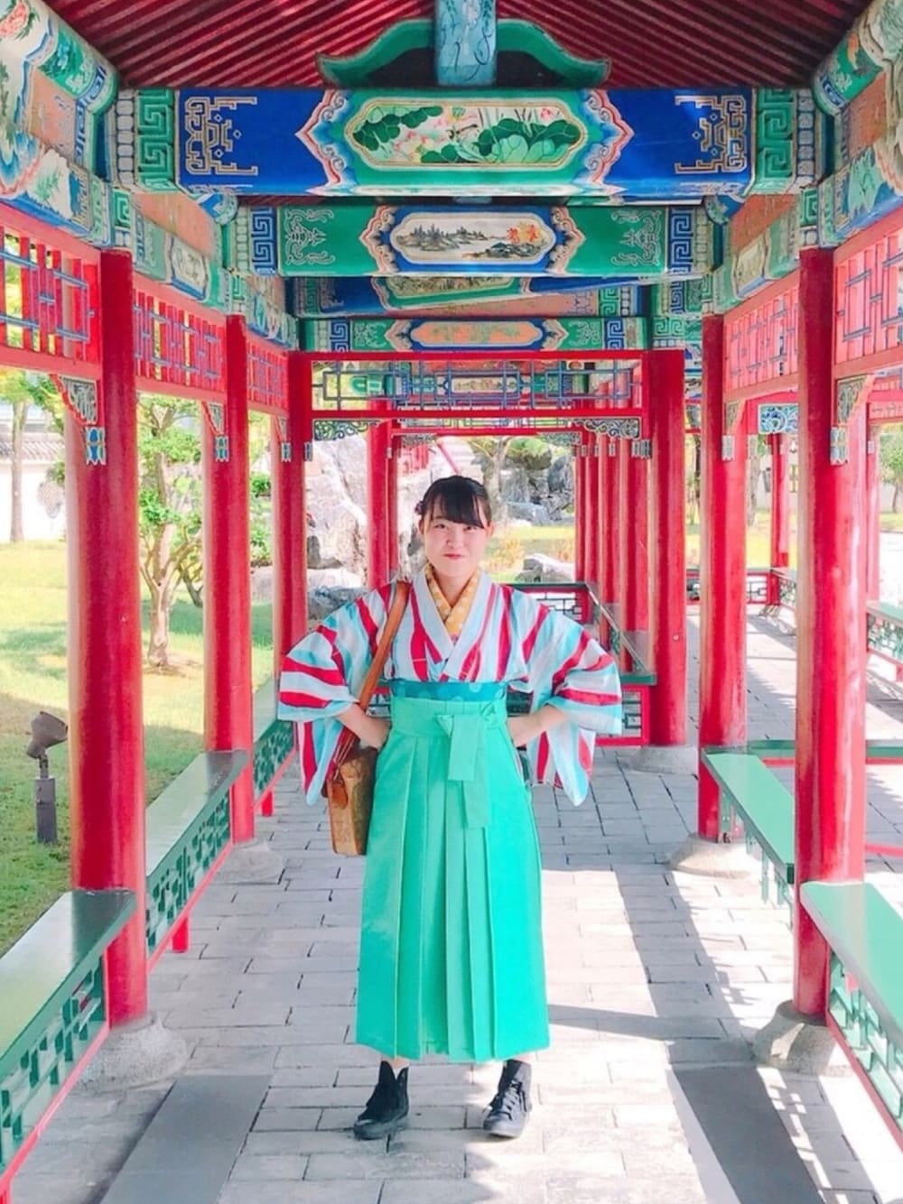 Outfit/ August 25 鳥取横断旅、1日目のコーデ︎☺︎ 友達とおそろいの袴でした💚 暑いので、上は仕立て衿に浴衣でした(笑) ちなみに写真は燕趙園で撮りました💞日本最大の中国庭園です🐲👲🏮🐼