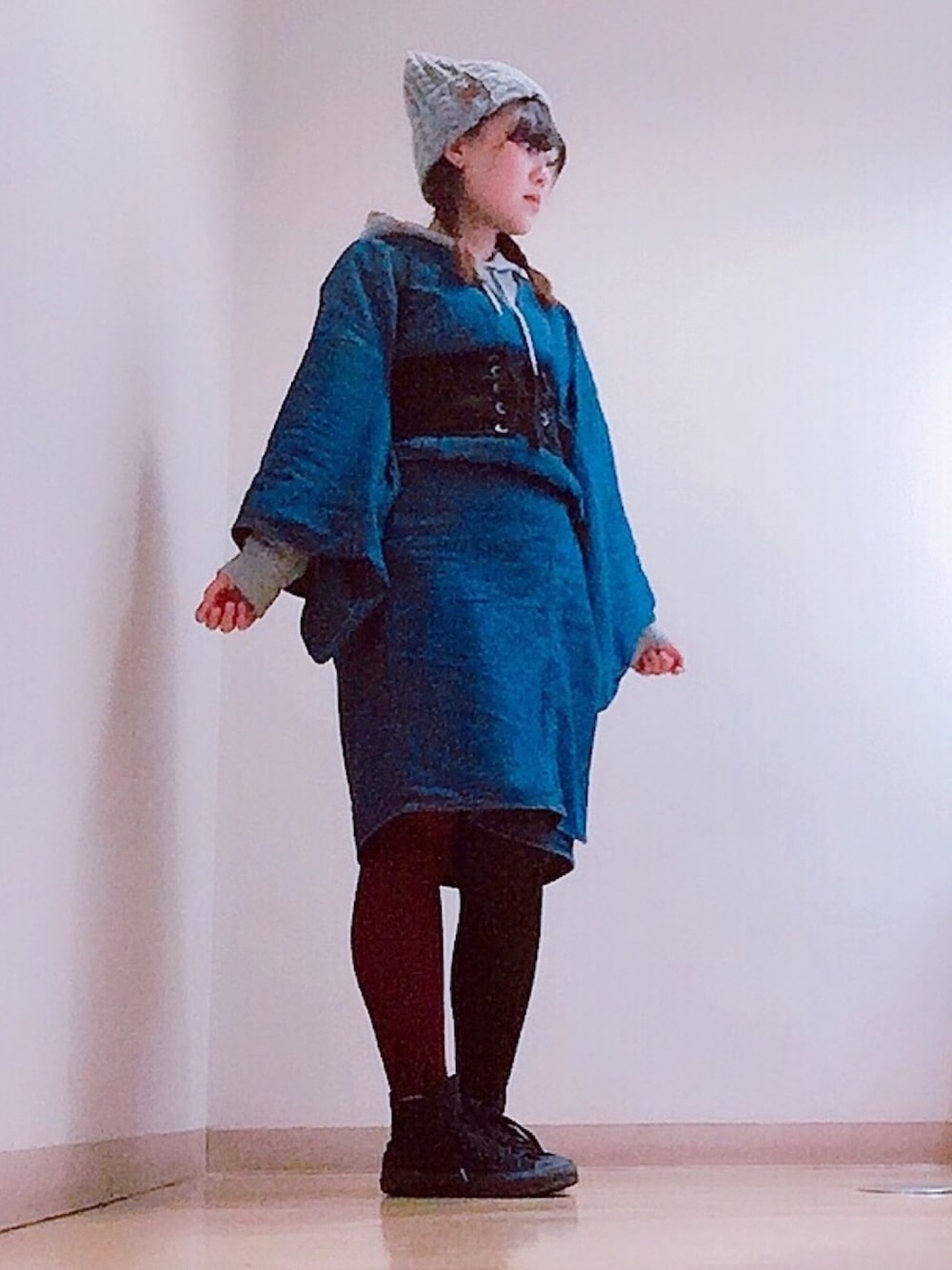 先月のコーデです(今更) デニム着物をミニ丈で。 パーカーIN、コルセットベルトでカジュアル〜♡