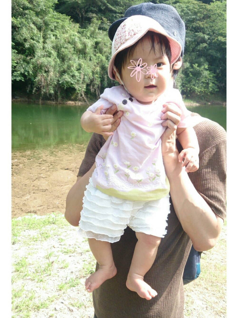 ご覧いただき、ありがとうございます🎵 先日のランチ会でいただいたトップスを着ました👕 前のプリントは、ぷっくりしてかわいらしいです。 昨日は主人も用事がないのでゆっくり。天気も良いので、キャンプ場へ。キャンプはしないけど、川がきれいで6月頃は蛍もたくさんいて、結婚する前から主人とのデート場所でした☆娘も一緒とは嬉しいものですね☺先日、初めての海も経験したのですが(足をつけた)、川の方が冷たかったのでしょう、足をずっと曲げていました( ´ー`)
