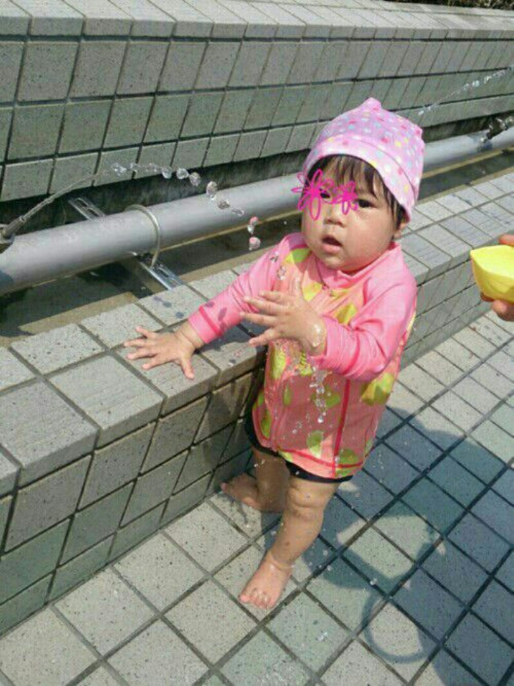2回目のじゃぶじゃぶ池🐤 今日は完全水遊びスタイル✨ やっぱり水着でよかった、頭からずぶ濡れ(^_^;) ラッシュガードは長袖だから着せにくいけど、柄がとっても好み🎵 帽子と水着はおさがり。帽子はプール用なのか不明ですが見た目はそれっぽい(笑) ご覧いただき、ありがとうございましたm(__)m