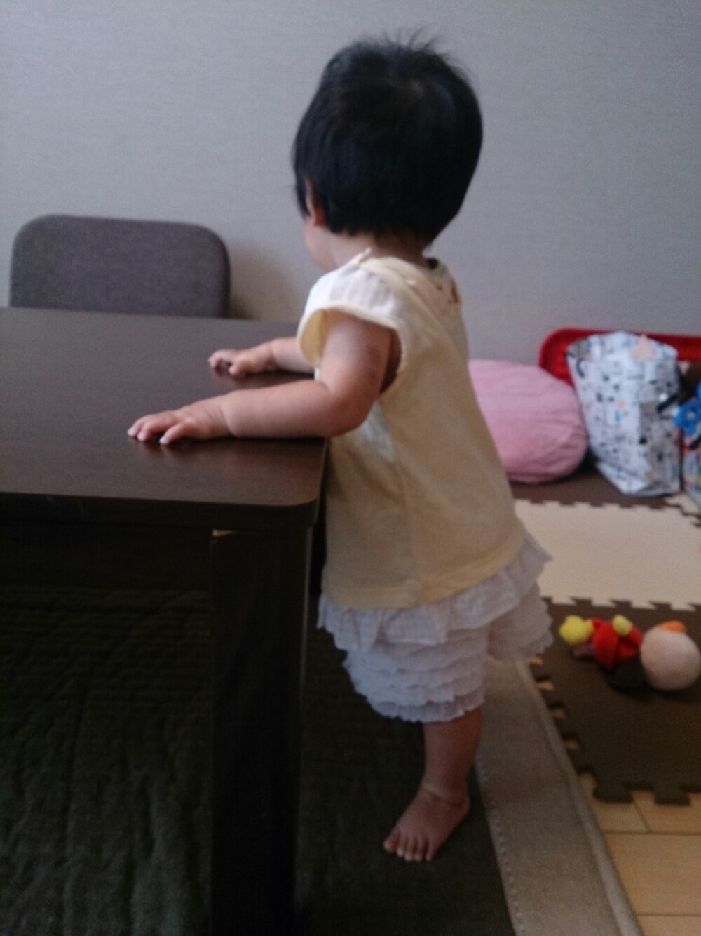 ずりばいしたら飾りが取れたトップスを久しぶりに着ました。もうハイハイなので、大丈夫( ´﹀` ) 今日は伯母さん家へ。東京に住んでいる親戚が帰ってきているので、集合。といってもお盆に会ってはいましたが。 6月産まれの同級生の男の子。会うのは2回目なので、少し慣れたようです( ´ー`)chiuとも距離が近付きました♥まぁ、chiuは左回りしか伝い歩きできないので、どんどん接近しています(笑)赤ちゃん同士、微妙に気にし合っててかわいかった🚼