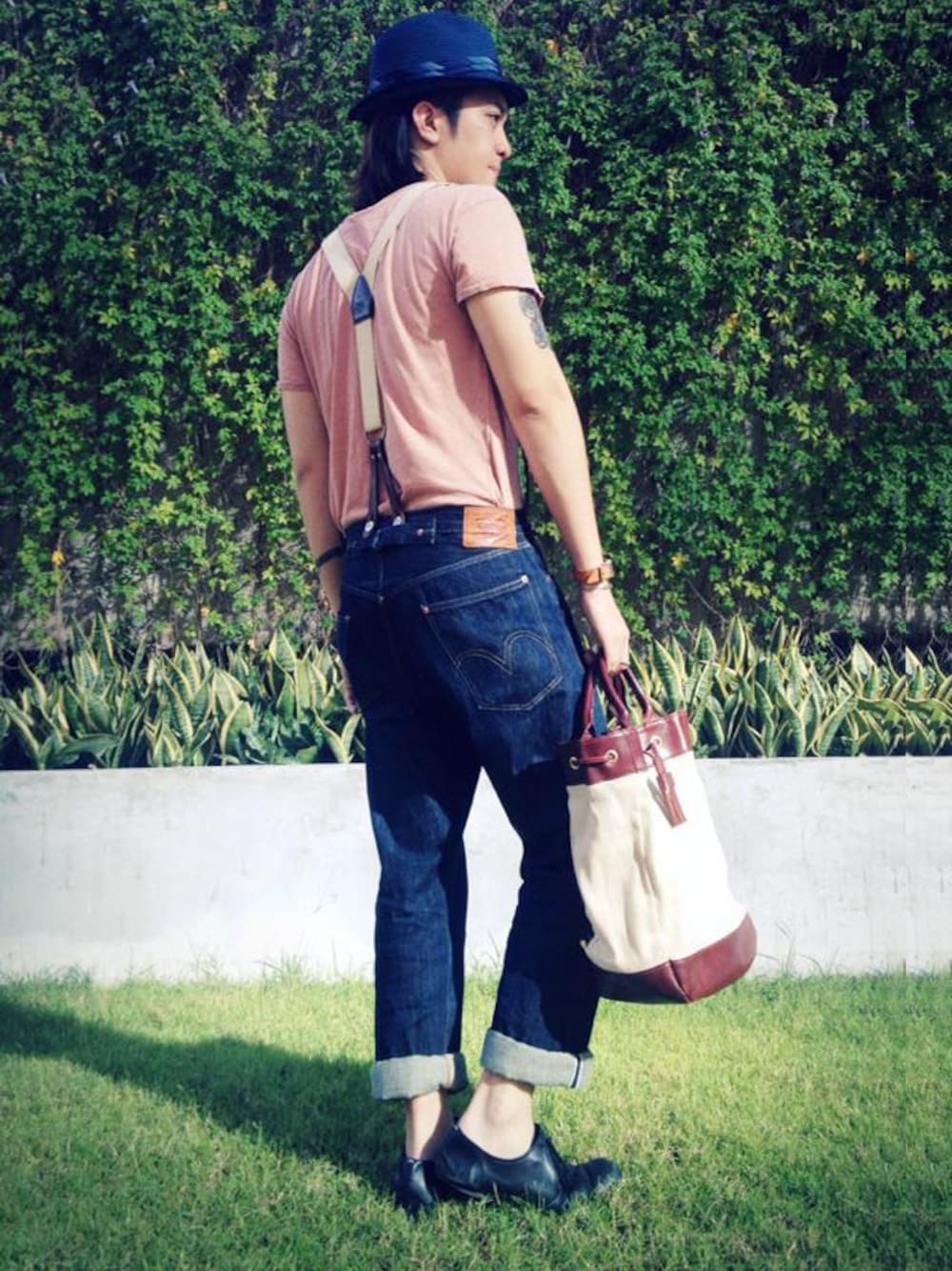 Goorin Bros 'Race Horse’ hat, 1930’s Sportswear Tee, Vintage leather suspender, Made In Eden ‘Hemp Rucksack' 1933 Levi’s Vintage Clothing 501 denim