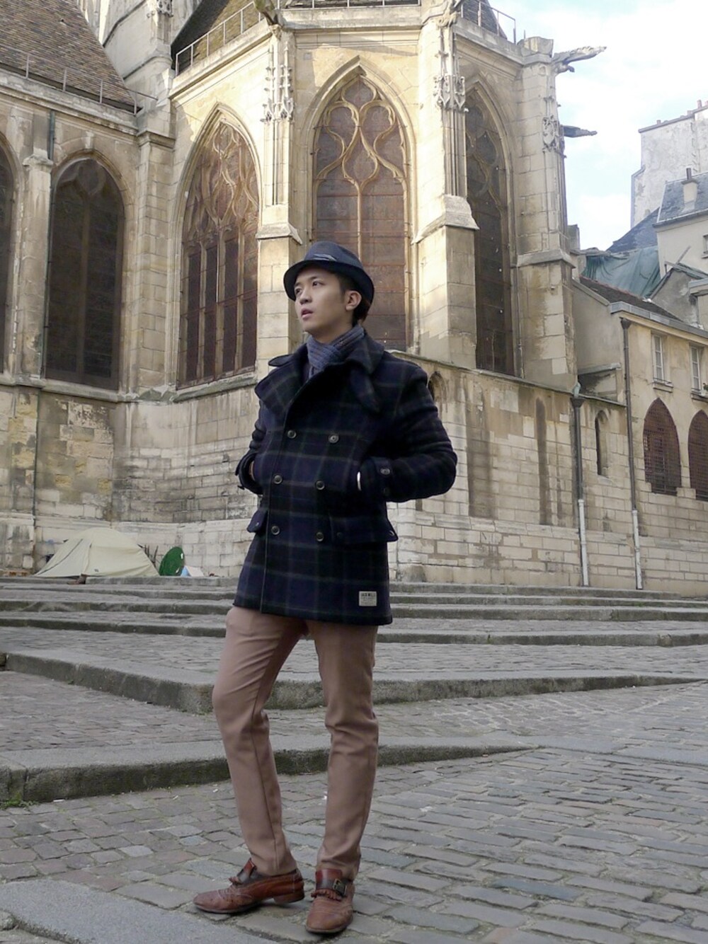 -Goorin Bros. fedora hat -local hand woven scarf -JACK WILLS pea coat -INITIAL twill pants -MOMA loafer