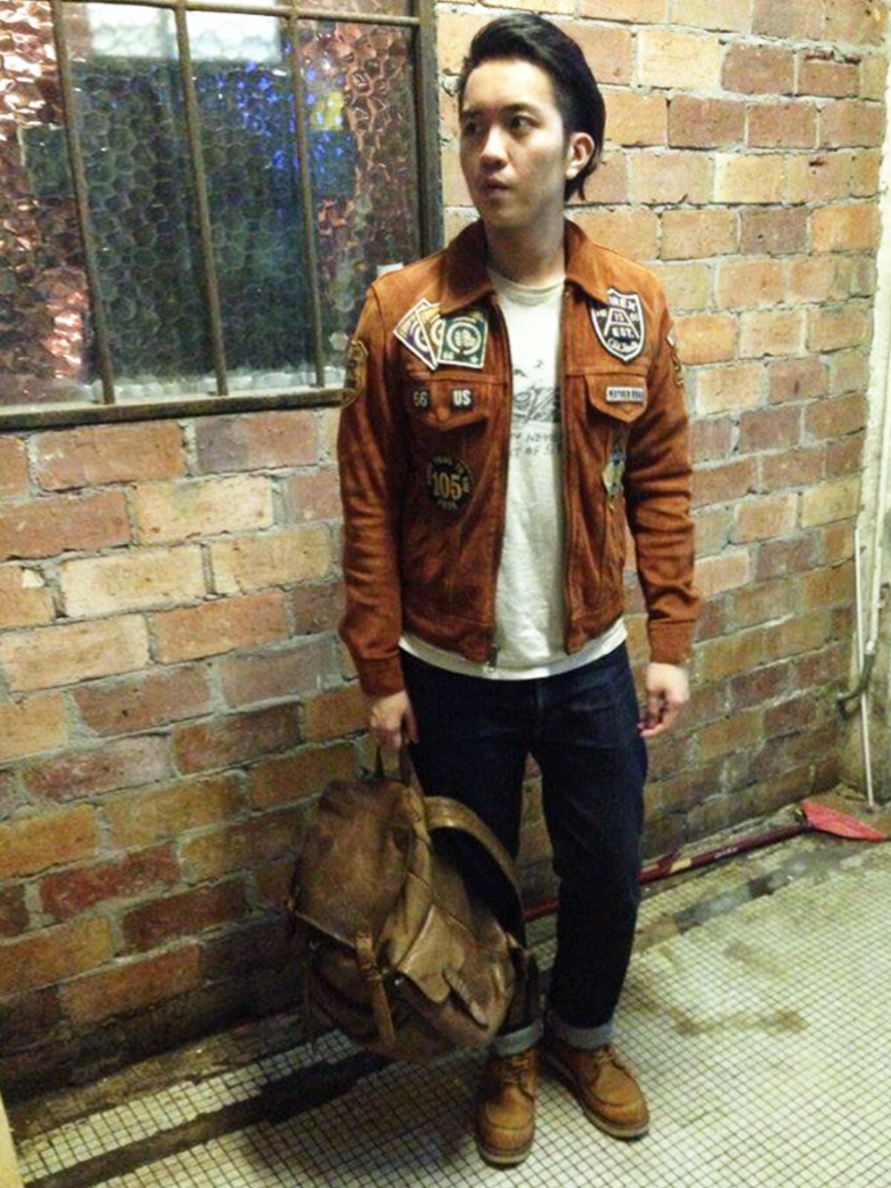 1980’s Trucker Style -Avirex Suede leather jacket -Evisu x Warehouse 0110 raw denim -Red Wing 877 -vintage military leather rucksack